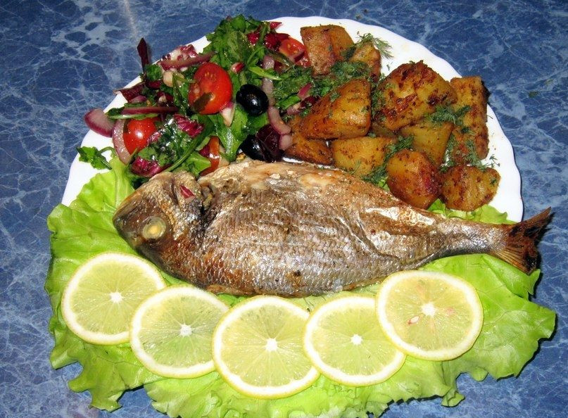 Для подачи красиво разложить листья свежего салата на плоскую тарелку, сверху разместить дорадо с лимоном, а сбоку – гарнир, например, жареный картофель или свежие овощи.