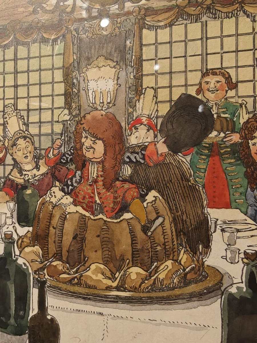Александр Бенуа с восхищением относился к эстетике XVIII века, чему посвящены многие его работы. Однако на выставке раскрываются и гастрономические интересы художника. Например, в его знаменитой "Азбуке" можно найти листы, на которых изображены чудеса кулинарного искусства — от карликов, вылезающих из паштета, до детей, удивляющихся пряничному домику и с наслаждением погружающихся в еду.