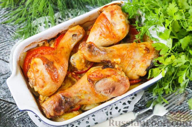 Наконец, куриные голени с картофелем, запеченные под соевым соусом с паприкой и карри, станут великолепным завершением любого ужина. Добавление жареного лука и помидоров усиливает насыщенность вкуса.