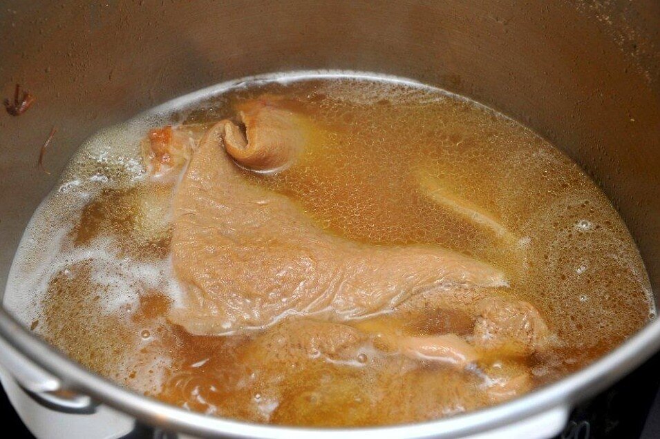Важным моментом в приготовлении является правильный выбор специй. Скопление вкусов создается за счет добавления: корня имбиря по вкусу, горошка черного и душистого перца (по 5-6 штук), майорана и укропа (по 0,5 ч. ложки), а также корицы, паприки (по 1 ч. ложке), соли и лаврового листа. Чтобы подготовить рубец, нужно замариновать его в 2 литрах воды с 2 ст. ложками соли и 5-6 ст. ложками уксуса в течение 4-5 часов.