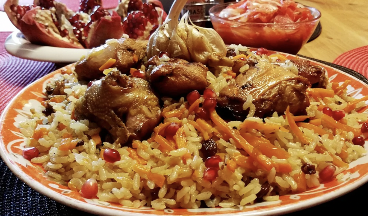 Кулинарная культура Востока не мыслима без плова, являющегося основным блюдом множества народов. У каждого из них имеются свои уникальные рецепты и нюансы в приготовлении. Азербайджан, как и многие другие страны, имеет свои традиции, включая начинку курицы пряностями и чесноком, которая затем жарится на открытом огне или запекается в духовке. Примечательно, что во время готовки рис не соприкасается с мясом, они соединяются только непосредственно перед подачей на стол.