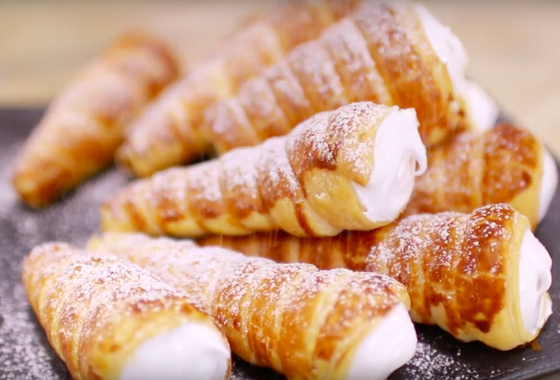 После этого смазываем формы маслом и оборачиваем их полосками теста, начиная с широкого края. Разогрейте духовку до 200°C и выпекайте трубочки около 20 минут, пока они не станут золотистыми.