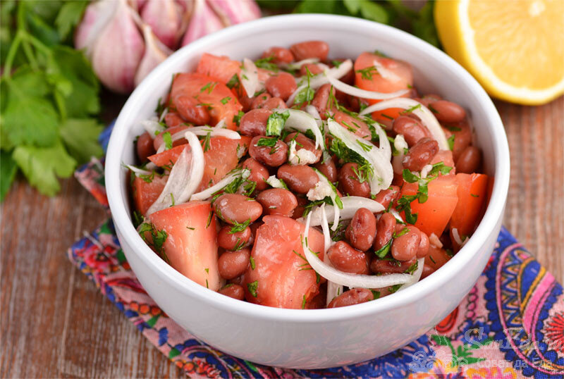 Чтобы салат оставался свежим, помидоры лучше разрезать вдоль и удалить семена. Это поможет избежать лишнего сока.Нарезанные помидоры помещаются в миску, а фасоль следует заранее промыть и освободить от жидкости.Лук нарезается тонкими дольками. К остальным ингредиентам добавляется нашинкованный лук.Для заправки нужно выжать чеснок, добавить сок лимона и растительное масло. Перчите по вкусу и тщательно перемешайте.Залейте заправку в салатник с луком – он немного замаринуется под кислым лимоном.Добавьте мелко нарезанную зелень, а при желании можно использовать сушеные травы, такие как орегано или базилик.Не забудьте посолить и все тщательно перемешать.Салат лучше подавать сразу же. Он порадует сочностью помидоров, мягкостью фасоли и легким хрустом лука. Чеснок и зелень придадут блюду насыщенный аромат и остроту.Это блюдо идеально подходит для подачи в качестве гарнира или самостоятельного легкого угощения. Приятного аппетита!