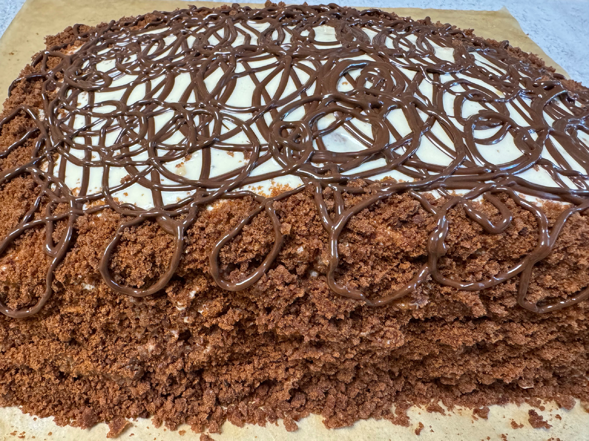 Второй торт складываем по той же схеме, обильно смазывая кремом и посыпая крошкой, а сверху украшаем растопленным шоколадом. И вот, ваши торты готовы!