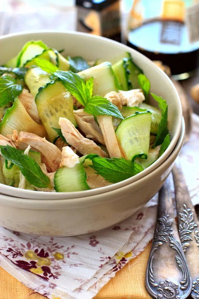- Сборка салата: Смешайте в одной тарелке курицу, огурцы, мяту и имбирь. Полейте заправкой, осторожно перемешайте и подавайте к столу.
