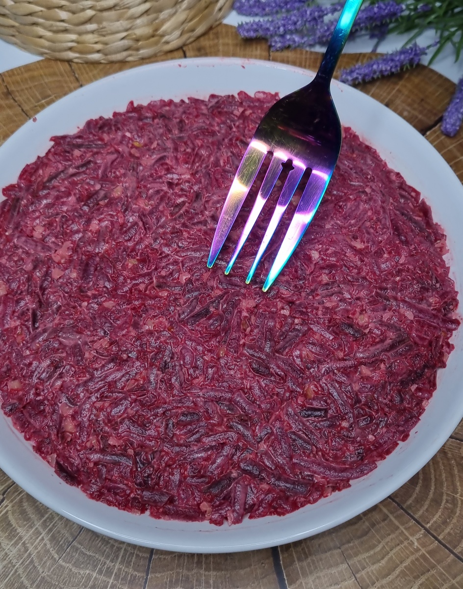 Если времени в обрез, можно сделать более быструю вариацию салата. Все ингредиенты: натертая морковь, вареная свекла, сыр, чеснок, изюм и орехи — просто смешиваются в одной миске и заправляются майонезом. Получается "дикий" вариант, но вкус остаётся таким же ярким и насыщенным.