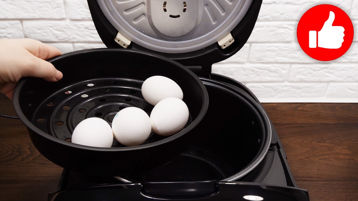 1. В чашу мультиварки налейте холодную воду, поставьте на решётку яйца и установите режим «На пару» на 10 минут.
