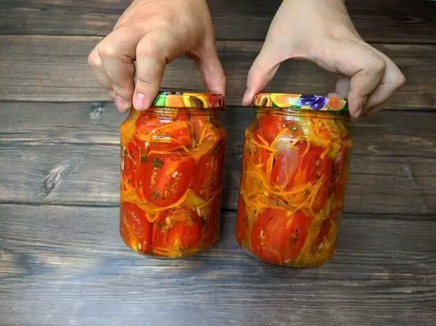 Готовя этот салат, важно выбрать свежие, упругие помидоры, лучше всего подойдут сорта "сливка". Овощи промыть, нарезать помидоры и перцы, а морковь натереть на терке. Все ингредиенты смешать в глубокой миске, добавить специи, уксус и масло. Оставить в холодильнике на 3 часа для настаивания.