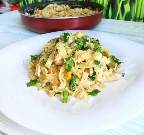 Сначала отварите макароны до состояния аль денте.Филе индейки тщательно промойте, нарежьте полосками и обжарьте на сухой сковороде до появления золотистой корочки, примерно 2-3 минуты.Добавьте немного воды, щепотку соли и специй, накройте и тушите в течение 20 минут.После этого добавьте нарезанный соломкой болгарский перец и пропущенный чеснок, тщательно перемешайте.Влейте сливки и готовьте под открытой крышкой еще 10 минут.Добавьте готовые макароны и перемешайте все ингредиенты, доведите до желаемой консистенции.Наконец, посыпьте тертым сыром и зеленью перед подачей.Это блюдо станет отличным вариантом для обеда или ужина, радуя вкусовыми оттенками и ароматом. Приятного аппетита!