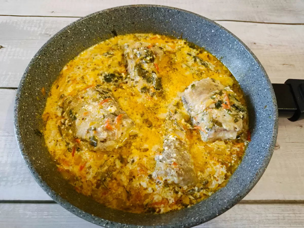 Обжаривать рыбу по 1 минуте с каждой стороны, после чего влить в сковороду сметану, смешанную с водой, и посыпать зеленью. Увеличьте огонь, доведите до кипения, затем убавьте и накройте крышкой. Готовить при легком кипении в течение 15 минут, перевернув рыбу на половине срока. Не забудьте попробовать соус на соль и корректировать его по вкусу. Готовить еще 10 минут, и блюдо готово к подаче, идеально сочетается с гарниром и поливается ароматным соусом.