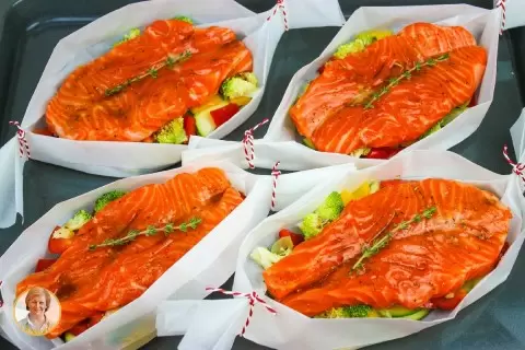 Запеченная красная рыба, поданная с овощами в стильных лодочках из пергамента, станет настоящим украшением любого праздничного стола. Это не только вкусно, но и невероятно полезно. За счет аромата гарнира и маринада рыба приобретает сочность и насыщенный вкус. Для блюда можно использовать любые предпочтительные ингредиенты, а благодаря простоте рецепта его сможет приготовить даже начинающий кулинар.