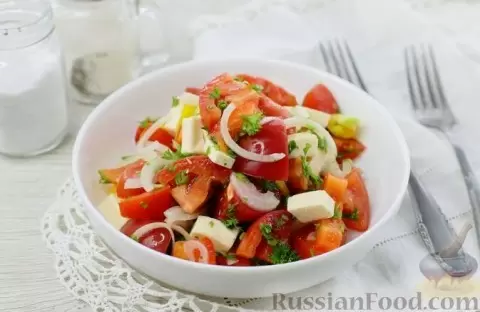 - Салат с помидорами, болгарским перцем и плавленым сыром: Этот салат готовится всего за несколько минут. Свежие овощи, такие как помидоры и перец, отлично сочетаются с нежными кусочками плавленого сыра, создавая идеальное гармоничное сочетание.