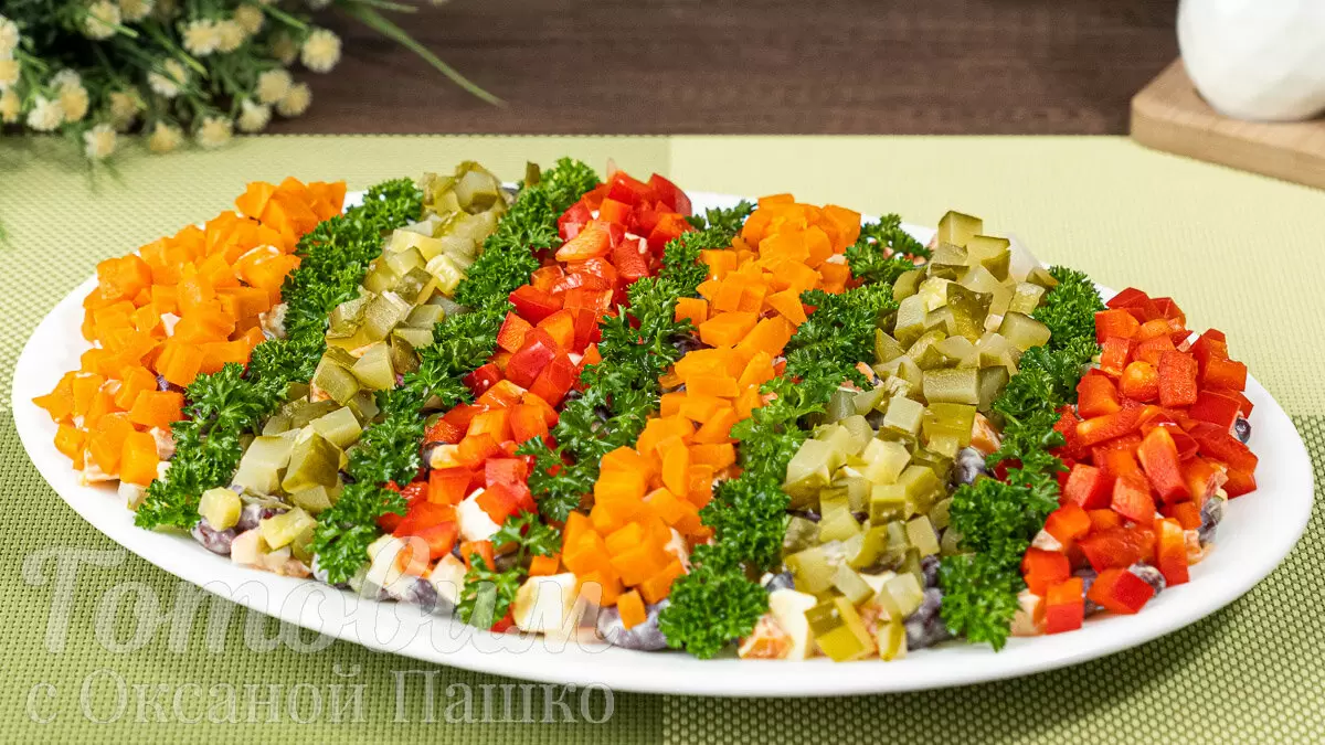 Представляем вам удивительный и простой в приготовлении салат, который станет настоящим украшением любого торжества. Этот неповторимый салат не требует мясных составляющих, однако его вкусовая палитра удивляет. Сочетание отварной моркови, яиц, соленого огурца и сытной фасоли создаёт гармоничный ансамбль, а маринованный лук добавляет кулинарной пикантности. Такой салат идеален как для праздников, так и для повседневных трапез.