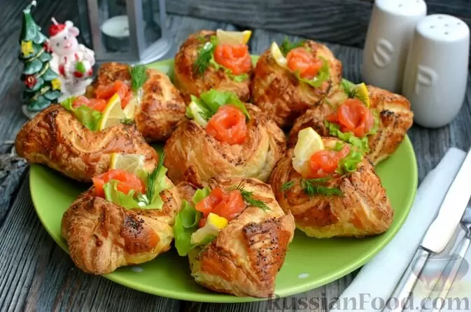 - Слоёные тарталетки с красной рыбой и сливочным сыром: Легко готовятся из готового слоёного теста, наполненного нежной начинкой. Они станут изюминкой вашего стола и отлично подойдут для фуршета.