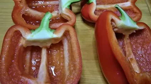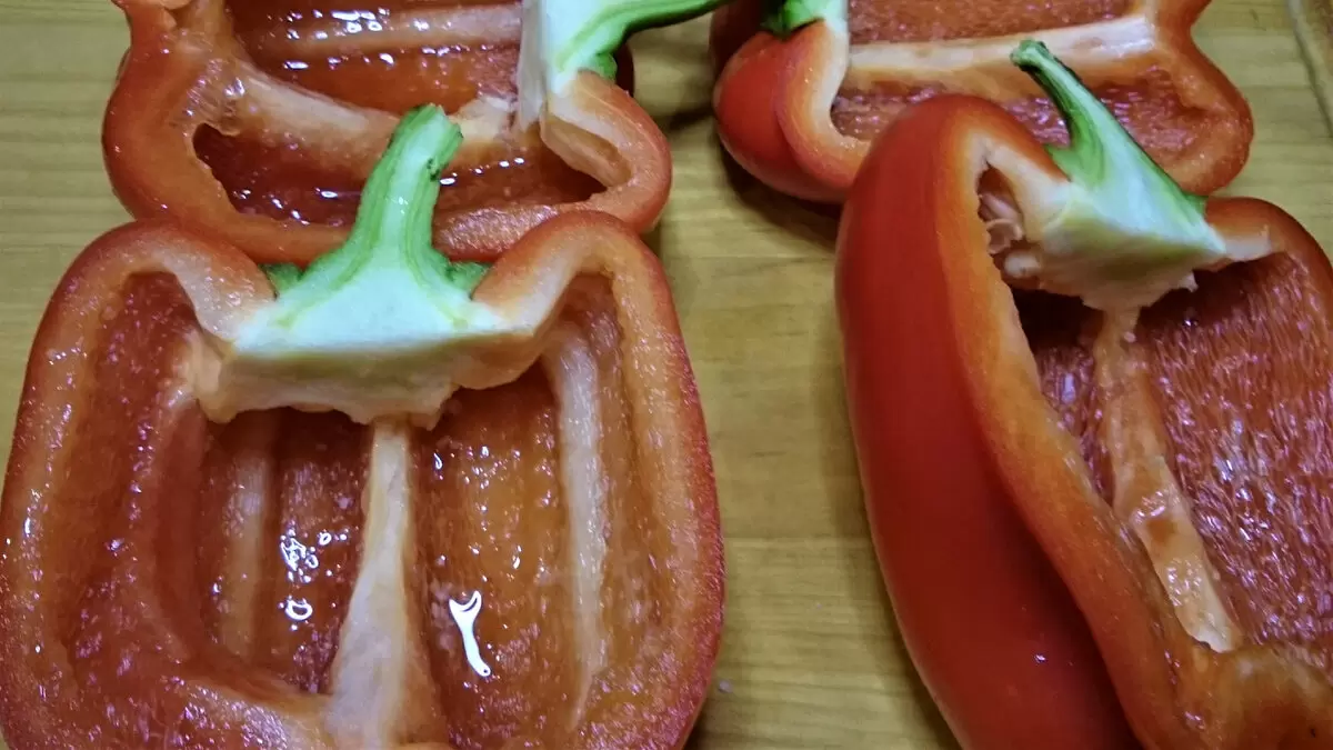 Сначала перцы аккуратно разрезают пополам, оставляя плодоножку. Избавившись от семян и перегородок, хвостики можно оставить для красоты. Внутреннюю часть полезно смазать растительным маслом и чуть присолить.