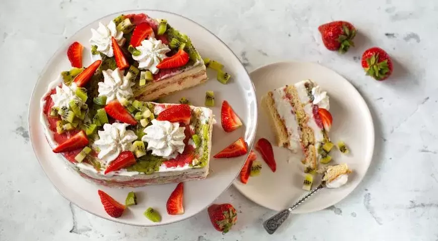 Сочетание крепкого, сладкого вкуса клубники с легкостью и кислинкой киви создает гармонию, которая никого не оставит равнодушным. Для подготовки этого торта не потребуется много времени, а его яркие цвета и вкусные слои станут настоящим украшением любого десерта!