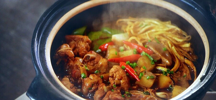 - В глубокой сковороде разогрейте растительное масло и обжарьте имбирь, чеснок и чили до появления аромата. Добавьте курицу и обжаривайте пару минут, помешивая. Влейте оставшуюся воду от грибов, добавьте грибы и сахар. Убедитесь, что вода почти полностью покрывает курицу, затем добавьте две столовые ложки соевого соуса, накройте и тушите 15 минут.