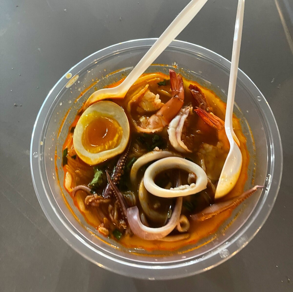Недавно был сделан еще один шаг на пути к поиску идеального том яма. К сожалению, вместо ожидаемого острого супа на основе зелени и морепродуктов был подан слегка острый рамен с морепродуктами и яйцом. От классического том яма не осталось и следа — ни лемонграсса, ни аромата кафир-лайма. Первый опыт, возможно, имел хоть какое-то отношение к оригиналу, но этот был откровенно неудачным.