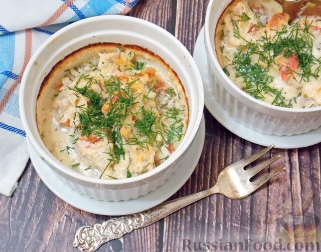 - Ингредиенты: филе трески, сметана, пармезан, помидоры, укроп, чеснок, соль, черный перец.