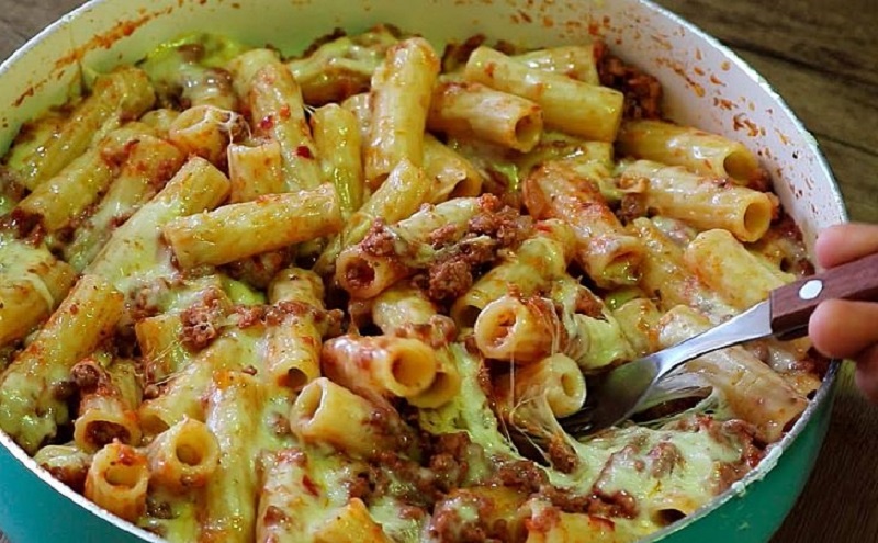 В форме для запекания выложите слой макарон, затем добавьте мясную начинку, и завершите всё тертой моцареллой. Блюдо можно готовить как в духовке, так и на медленном огне под крышкой.