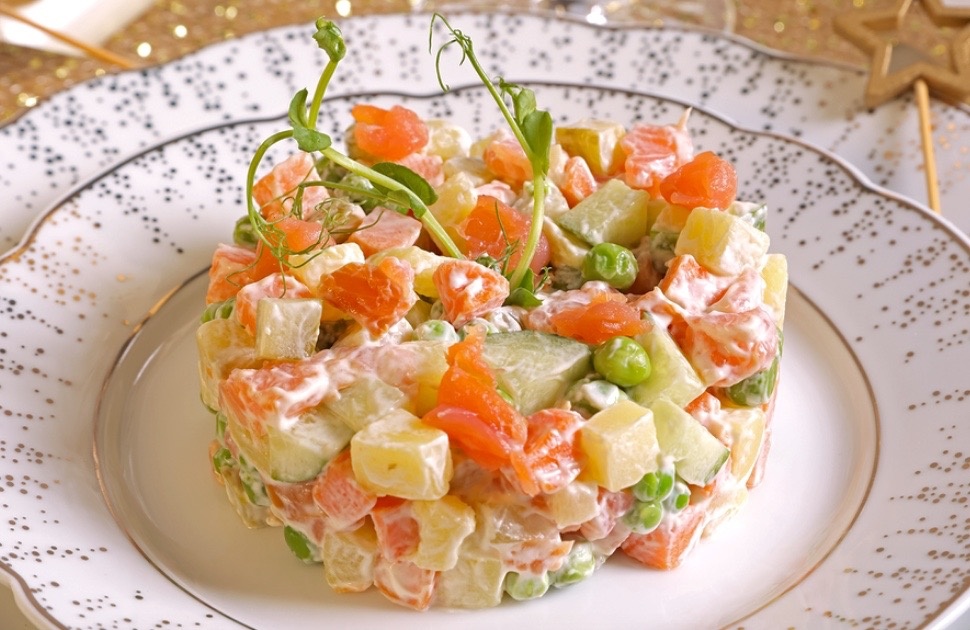По мотивам классического оливье, этот салат включает в себя томленую севрюгу и дополнительные сладкие корни. Рекомендуется готовить севрюгу в рыбном бульоне, что сделает вкус более насыщенным.