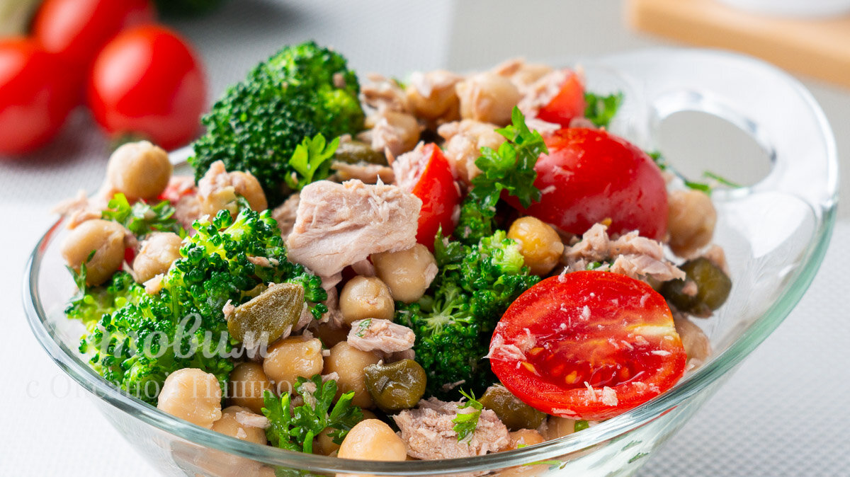 В этом салате прекрасно комбинируются помидоры черри, брокколи и консервированный нут с нежным тунцом. Особую изюминку добавляет заправка на основе оливкового масла и свежевыжатого лимонного сока, которая раскрывает вкус блюда. Приготовление этого салата занимает совсем немного времени и сил, поэтому стоит попробовать его в действии!