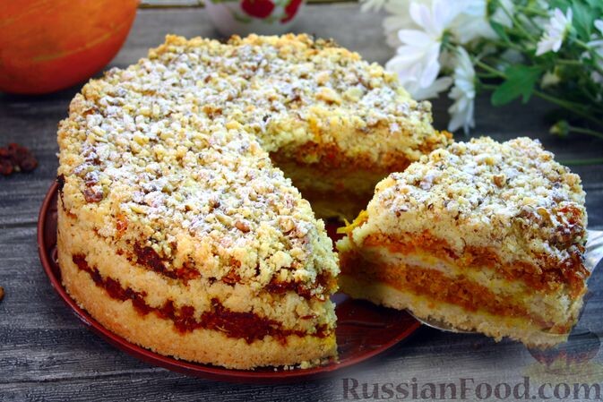 Этот пирог станет настоящей находкой для любителей тыквы. Для его приготовления используется песочное тесто из равных частей муки, манной крупы и сливочного масла. Начинка состоит из тертой тыквы с добавлением цитрусового сока и цедры, что придаёт ей яркий аромат. Готовый пирог посыпается измельченными орехами, что добавляет ему хрустящей текстуры.