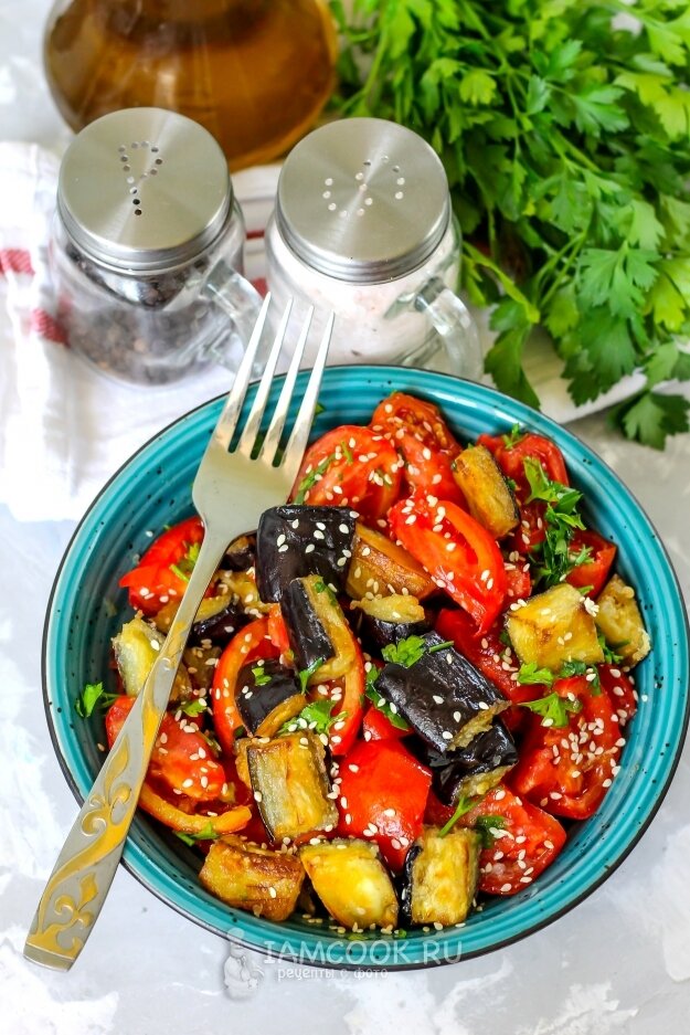 На разогретой сковороде с растительным маслом обжаривайте баклажаны около четырех минут до золотистой корочки. После этого аккуратно выложите их в салатник.