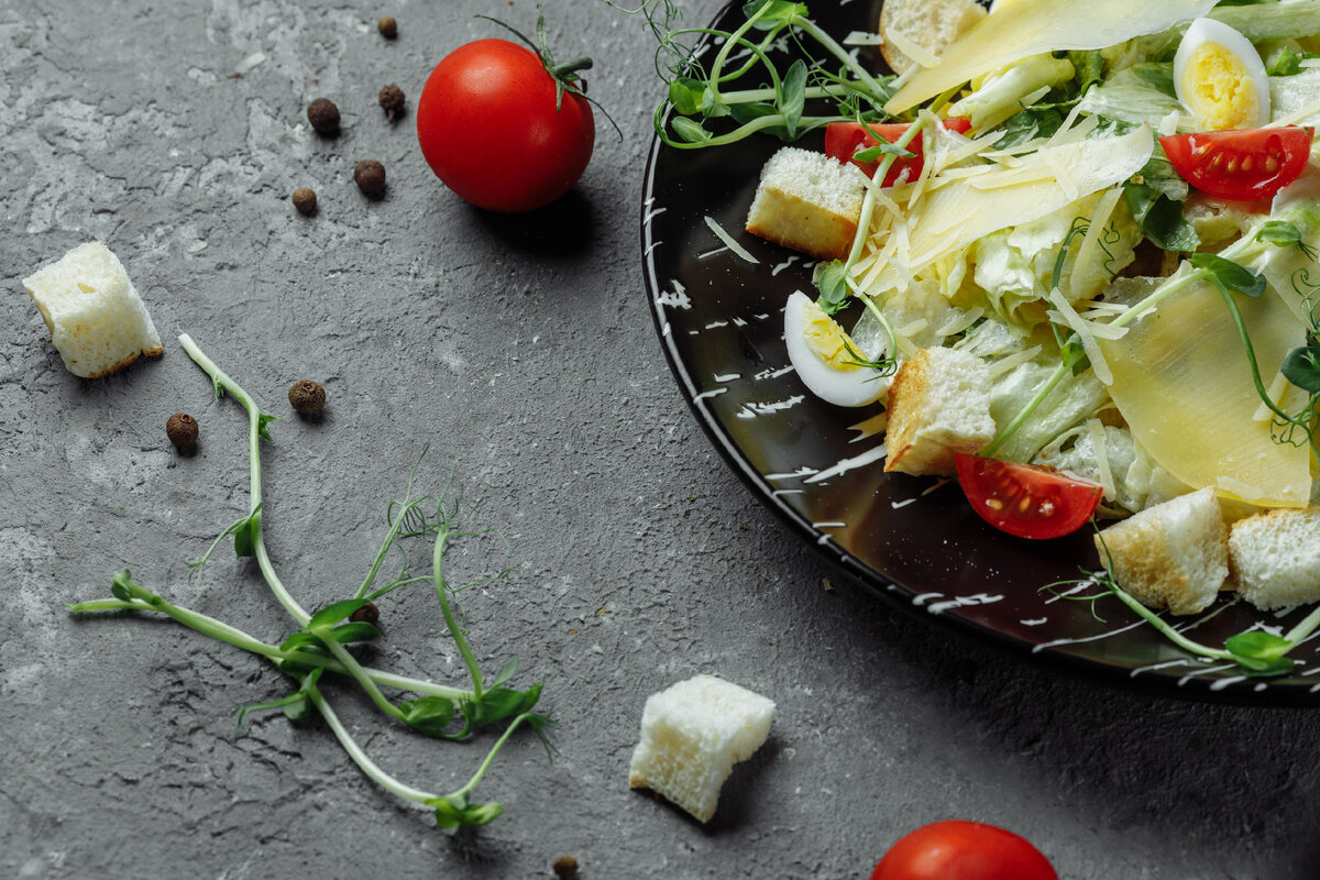Гренки придают салату оригинальный хруст и насыщенность. Их можно вводить в состав салата или подавать отдельно, чтобы каждый гость сам решал, в каком количестве добавлять хрустящие кусочки. Гренки лучше всего готовить из свежего хлеба — жаря его до золотистой корочки на сковороде или в духовке. Однако для более низкой калорийности стоит обратить внимание на способ приготовления.