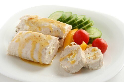 Сладкий перец необходимо очистить от семян и нарезать мелкими кубиками.Чеснок очистить и мелко нарезать.Укроп также следует порубить.В глубокой миске объедините творог, подготовленные перец, чеснок и зелень. Хорошо перемешайте и приправьте смесь по вкусу солью и перцем.Разогрейте духовку до 180 градусов.Филе индейки промойте, обсушите и нежно отбейте. Приправьте солью и перцем, затем выложите на него приготовленную творожную начинку и аккуратно сверните в рулет. Закрепите рулет при помощи кулинарной нити.На сковороде нагрейте 2 столовые ложки масла и обжарьте рулет со всех сторон до золотистой корочки. После этого переместите его в духовку и запекайте около 1 часа.Затем смажьте рулет апельсиновым джемом и оставьте в духовке еще на 15 минут.Салат как гарнир