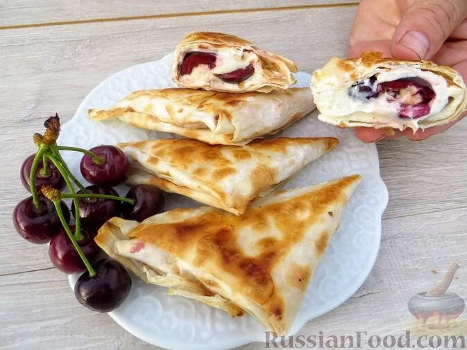Не менее интересным будут треугольнички из лаваша с творогом, бананом и вишней. Этот простой и вкусный вариант порадует вас хрустящей корочкой и нежной начинкой, которая сочетает в себе сладость банана и кислинку вишни.