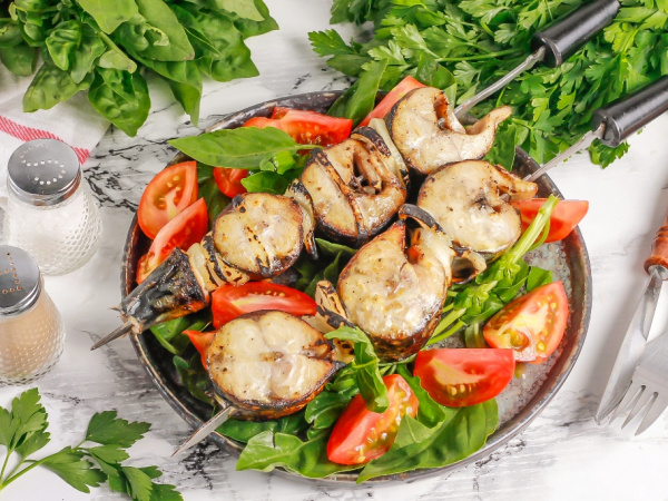 Подавайте ароматный шашлык из скумбрии с овощами и свежей зеленью — это будет истинное наслаждение!