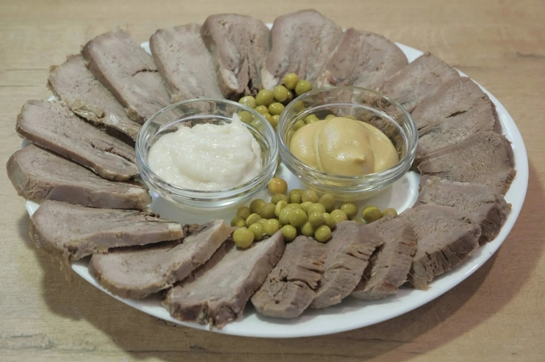 Готовый говяжий язык нарезается тонкими слайсами и подается с горчицей, хреном и зелёным горошком. Это будет не просто вкусно, но и красиво!