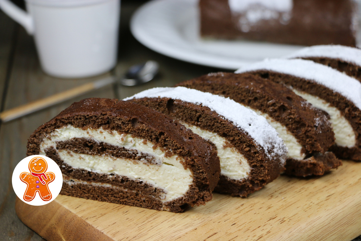 Распечатываем рулет, равномерно распределяем крем, оставляя 2 см на краю. Снова сворачиваем рулет и помещаем его в холодильник на 2-3 часа. После охлаждения аккуратно разворачиваем, подравниваем края и украшаем по желанию.