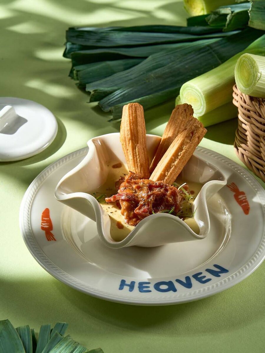 - Крем-суп из порея с томленой говядиной: нежный суп, приготовленный из запеченного порея, с добавлением томленой говядины и хрустящих чуррос.