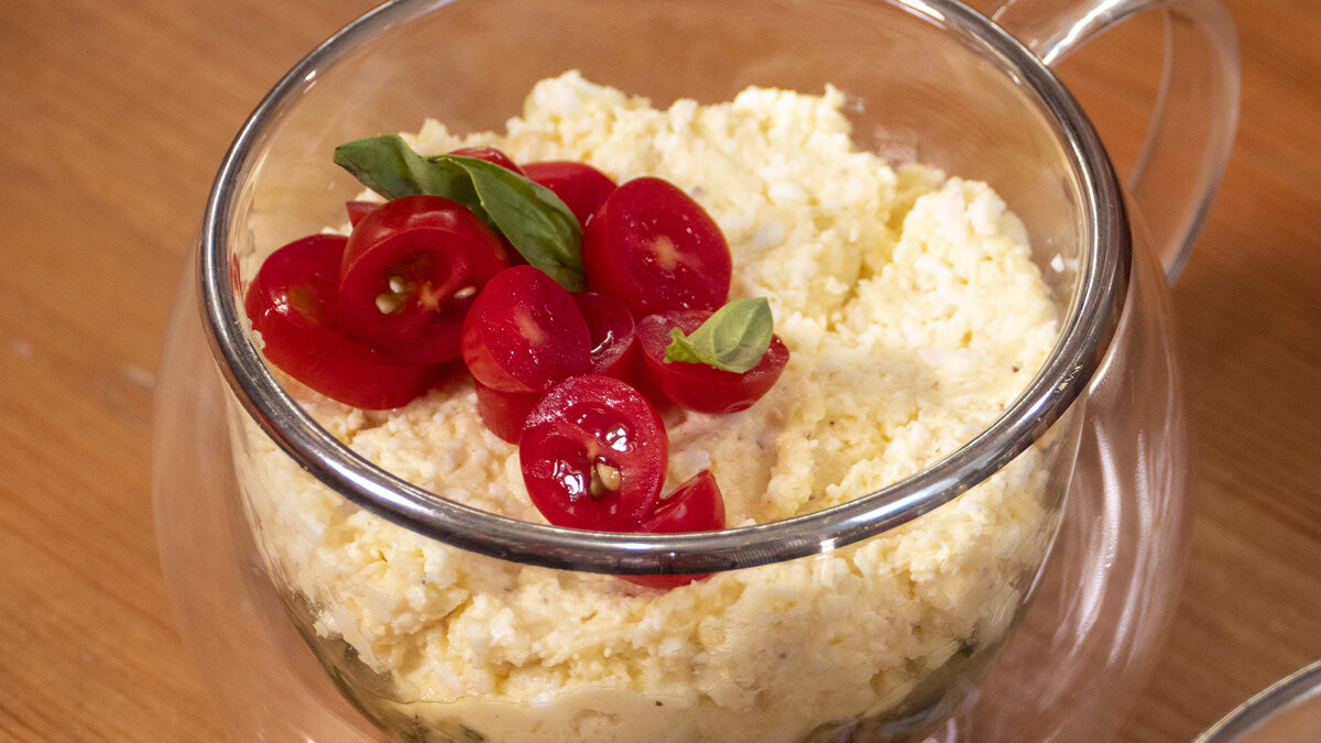 Мелко нарезать кинзу и запеченные кабачки, добавить в общую массу и аккуратно перемешать. Для презентации салата можно использовать прозрачные бокалы: выложите в них слоями яично-сырную массу и запечённые кабачки с кинзой. Верхний слой украсить разрезанными пополам черри и свежими листиками базилика. Подавайте на стол!