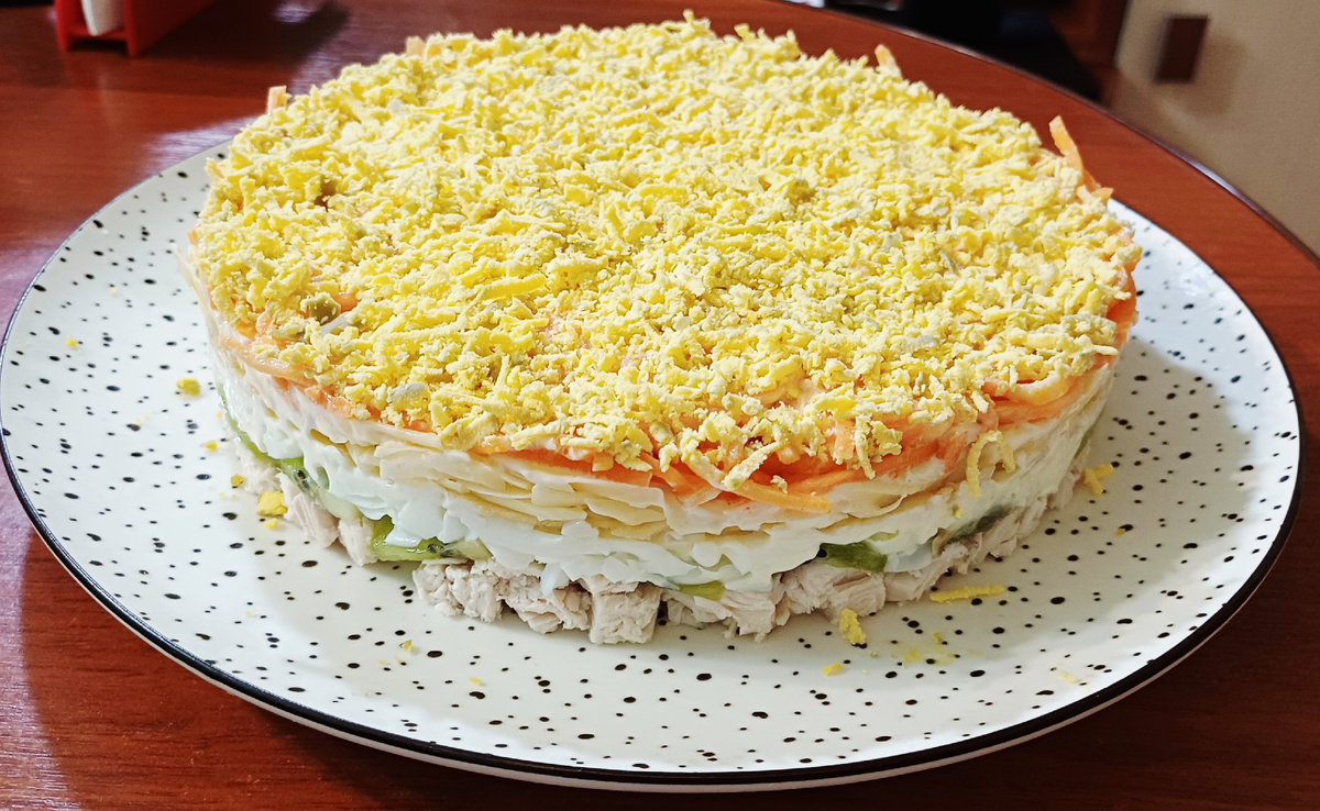 Этот салат — настоящая находка для ценителей оригинальных вкусов. Его можно подать как в кольце, так и без него, и он обязательно станет звездой вашего стола. Рецепт, впервые опробованный в нашей кухне, впечатлил всех, и теперь его можно рекомендовать каждому гурману.