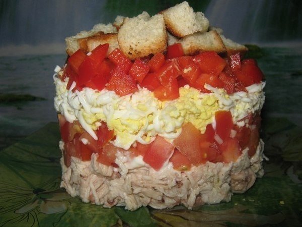 Теперь пора собирать салат! Выложите все ингредиенты слоями в следующем порядке: куриная грудка, помидоры, чеснок, яйца, сладкий перец и сухарики. Каждый слой следует аккуратно промазать майонезом для получения насыщенного вкуса.