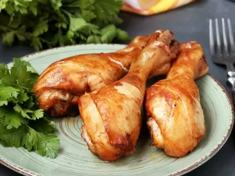 По истечении времени куриные голени выкладываются в форму, а оставшийся маринад выливается сверху. Духовка разогревается до 180 градусов, и в ней они запекаются около 40 минут. Готовность можно определить по румяной корочке, а мясо внутри будет мягким и легко отделится от кости.