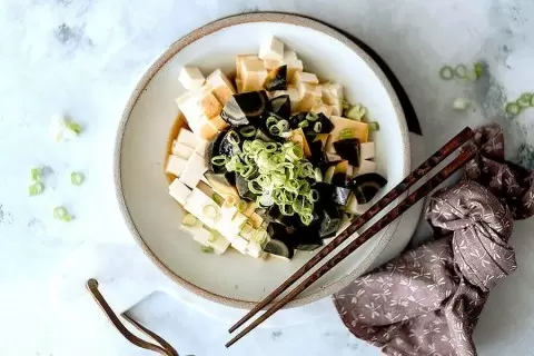 Тофу в сочетании со столетними яйцами — это оригинальная закуска, которая завоевала популярность среди любителей экзотических блюд. Для её приготовления понадобятся всего пять ингредиентов и несколько минут.