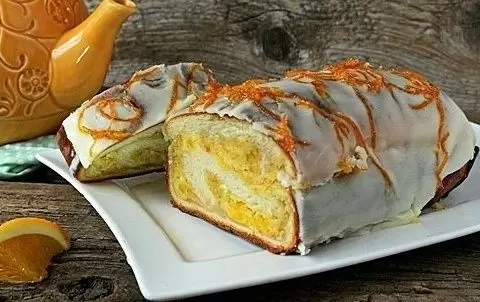 Начинка готовится на основе миндальной муки, сахара, апельсиновой цедры и ликера. Если ликера нет, его можно заменить соком. Оставшееся тесто раскатывается в прямоугольный пласт, смазывается джемом, равномерно распределяется начинка и кусочки апельсина. Затем кекс аккуратно сворачивается в рулет и укладывается в форму.