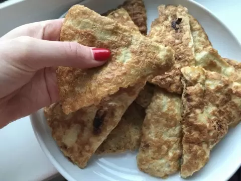Каждый треугольник важно запанировать в муке, обмакнув края в нее. Далее окуните их в приготовленный омлет из 3-х яиц, ст. ложки сметаны и щепотки соли. Обжаривайте на сковороде с растительным маслом с обеих сторон до золотистой корочки. Несмотря на то, что треугольники не хрустящие, они необычно вкусные, а во многом напоминают пирожки.