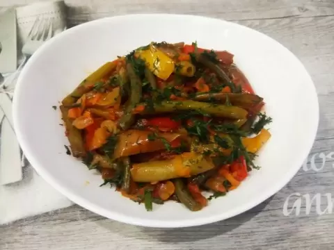 В сковороду добавить нарезанные овощи — болгарский перец, стрелки чеснока и фасоль, а также лавровый лист. Тушить на медленном огне, периодически помешивая, около 25 минут.