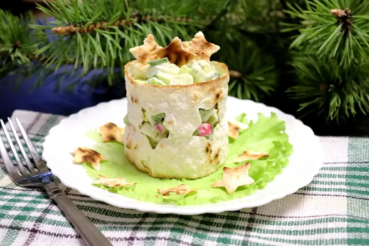 Соберите салат в заранее подготовленные стаканчики из лаваша и подайте на стол — кушанья будут выглядеть не только стильно, но и очень аппетитно!