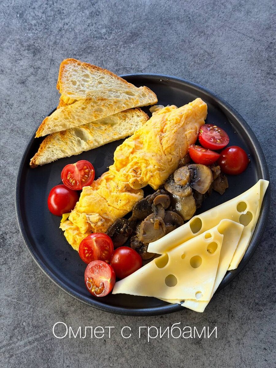 - Воскресенье: Омлет с сыром и зеленью. Взбейте яйца, добавьте тертый сыр и зелень, обжарьте до румяной корочки — питательный и сытный завтрак.