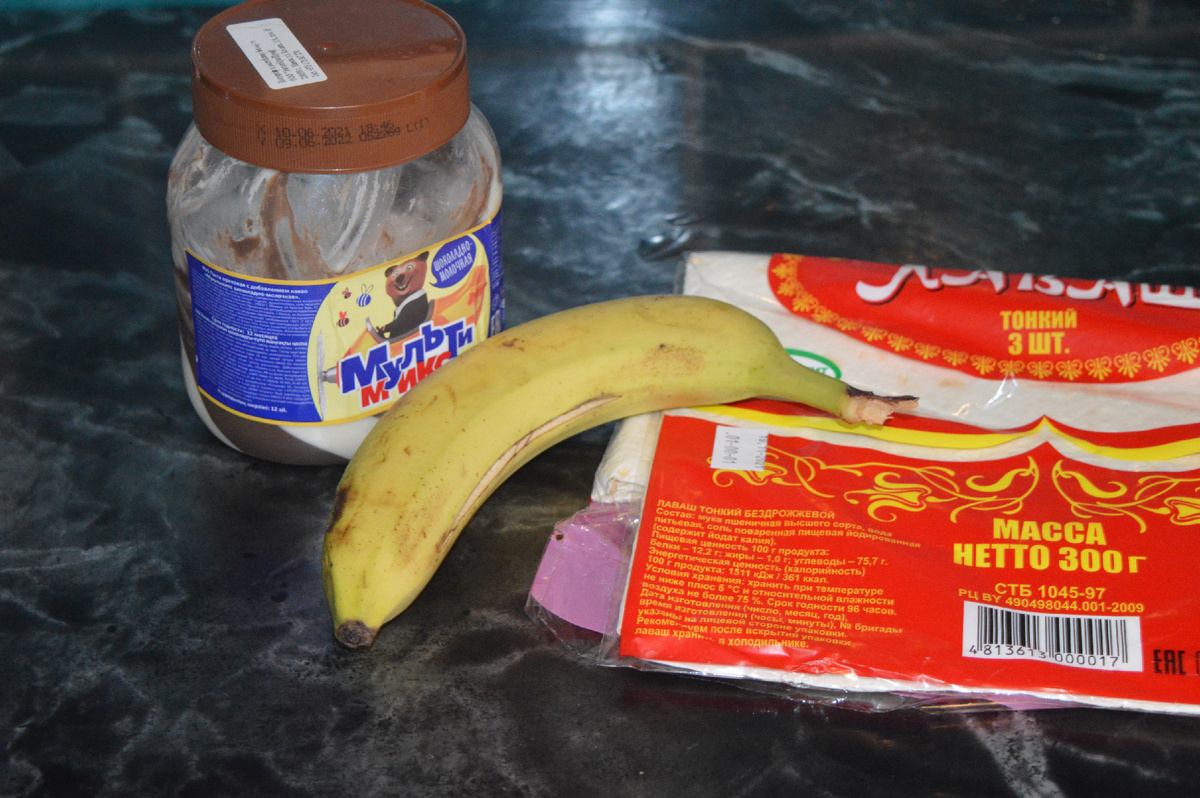Очистите банан от кожуры и нарежьте его по желанию. Поместите ломтики банана на лаваш поверх шоколадной пасты. Далее аккуратно заверните лаваш в рулет, начиная с одного края и постепенно закручивая до конца.