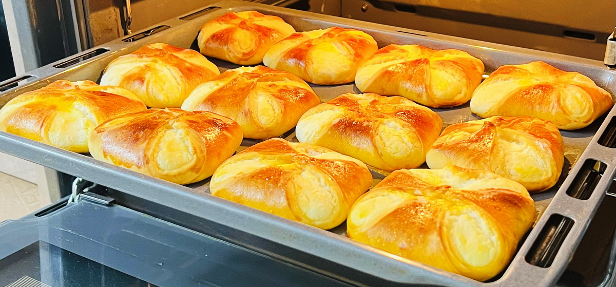 Когда тесто будет готово, его раскатывают в прямоугольный пласт толщиной около пяти миллиметров и нарезают на двенадцать частей. В центр каждой из них выкладывается начинка, после чего тесто складывается в виде конверта. Заготовки оставляют на 30 минут для расстойки, а затем выпекаются в предварительно разогретой духовке при температуре 180 градусов на протяжении 25 минут. Как только ватрушки готовы, их стоит подавать к столу горячими — они разлетаются со стола в считанные минуты!