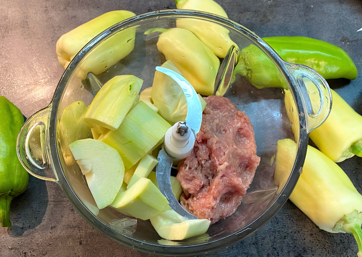 - Сначала в блендере соединяют мясо индейки и нарезанные кусочки очищенного кабачка. Если кабачки молоденькие, можно пропустить этап очистки.